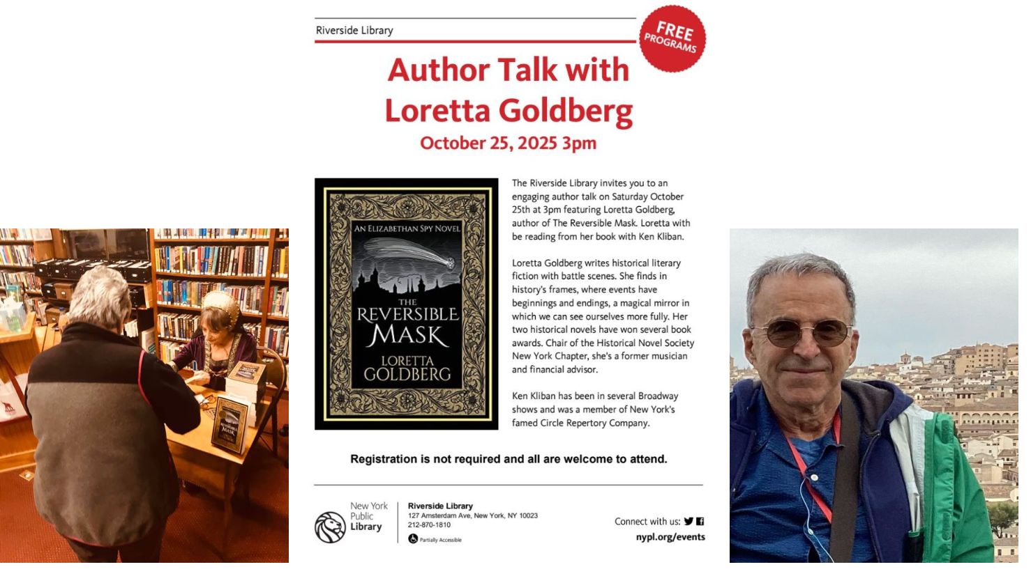 The Riverside Library at 127 Amsterdam Avenue, next to Julliard, invites you to an engaging author talk on Saturday October 25th at 3pm featuring Loretta Goldberg, author of The Reversible Mask. Loretta with be reading from her book with Ken Kliban. Loretta Goldberg writes historical literary fiction with battle scenes. She finds in history’s …